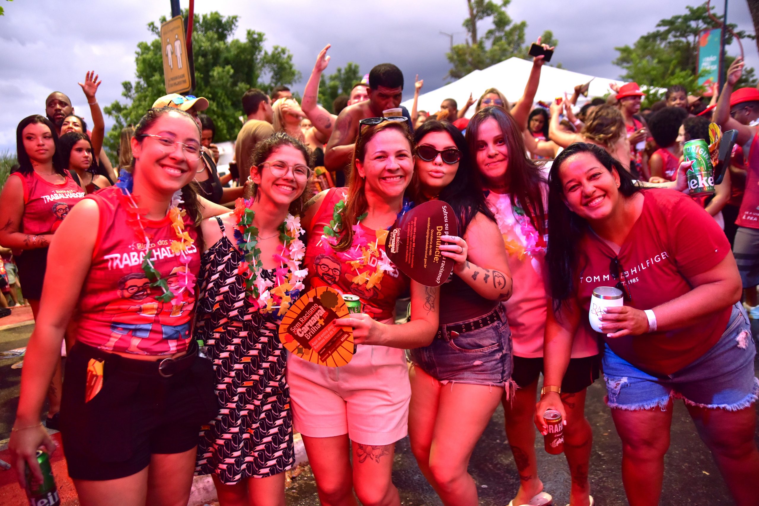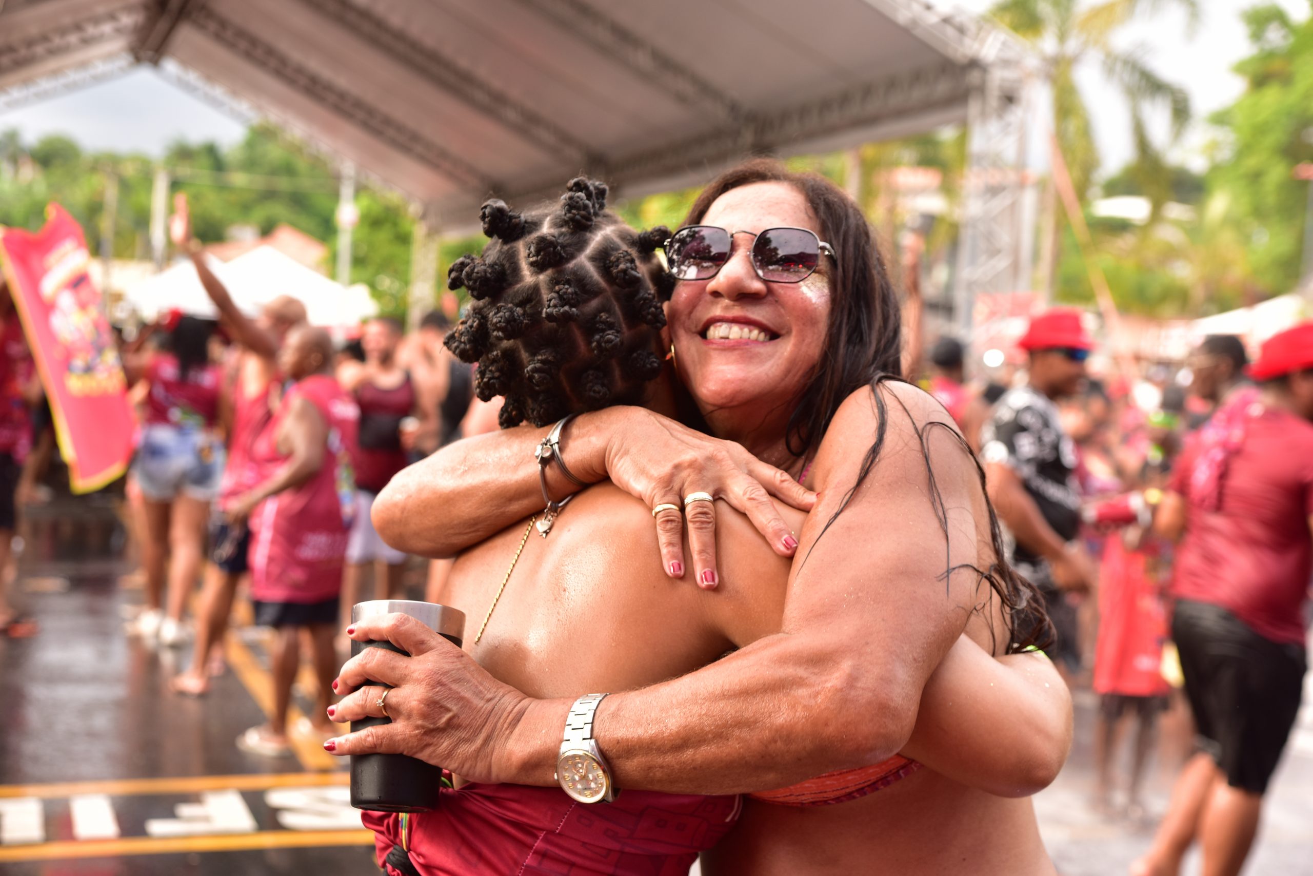 Equipes da Secretaria de Trânsito e Engenharia Viária (Sectran) organizam o fluxo de veículos e pedestres, enquanto a Secretaria de Transportes e Postura realiza a substituição de embalagens de vidro por recipientes plásticos, contribuindo para a segurança dos foliões.