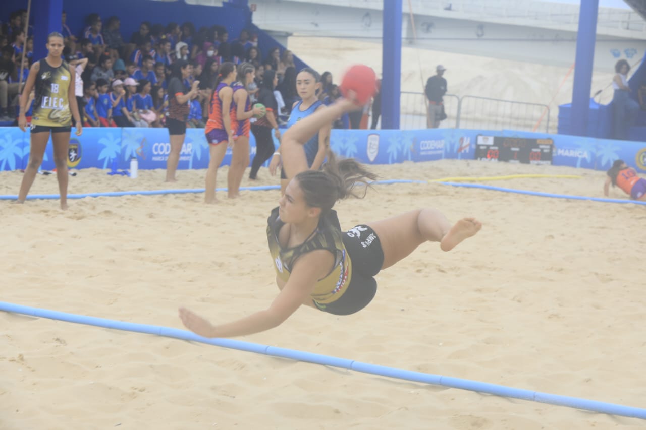 O primeiro dia de disputas do Circuito Brasileiro de Handebol de Areia movimentou a arena montada na Barra de Maricá nesta quarta-feira (27/03). Onze equipes da categoria juvenil se enfrentaram entre si buscando uma vaga nas etapas finais, que acontecem nesta quinta-feira (28), tendo nas arquibancadas a torcida de alunos de escolas da rede municipal de ensino. A competição é promovida pela Confederação Brasileira de Handebol (CBHb), em parceria com a Companhia de Desenvolvimento de Maricá (Codemar) e a Secretaria de Esporte e Lazer de Maricá, com transmissão ao vivo pelo canal da CBHb no Youtube.