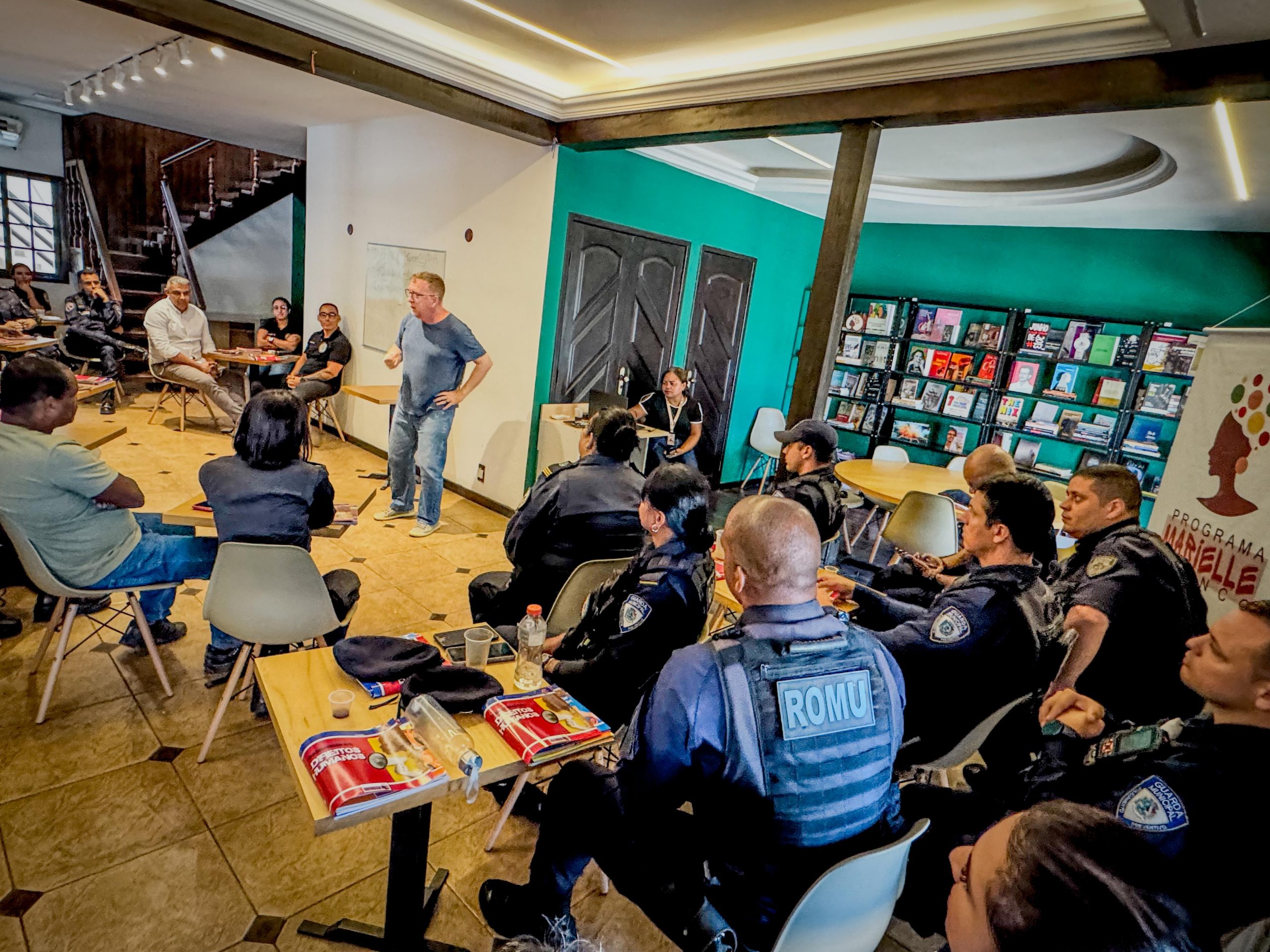Equipes da Guarda Municipal de Maricá, incluindo profissionais da Patrulha Maria da Penha, Ronda Escolar e Secretaria de Segurança Pública, participaram de um seminário de direitos humanos com o professor Manuel Gádara, na sede do Programa Marielle Franco em Maricá, nesta quarta-feira (26/02).