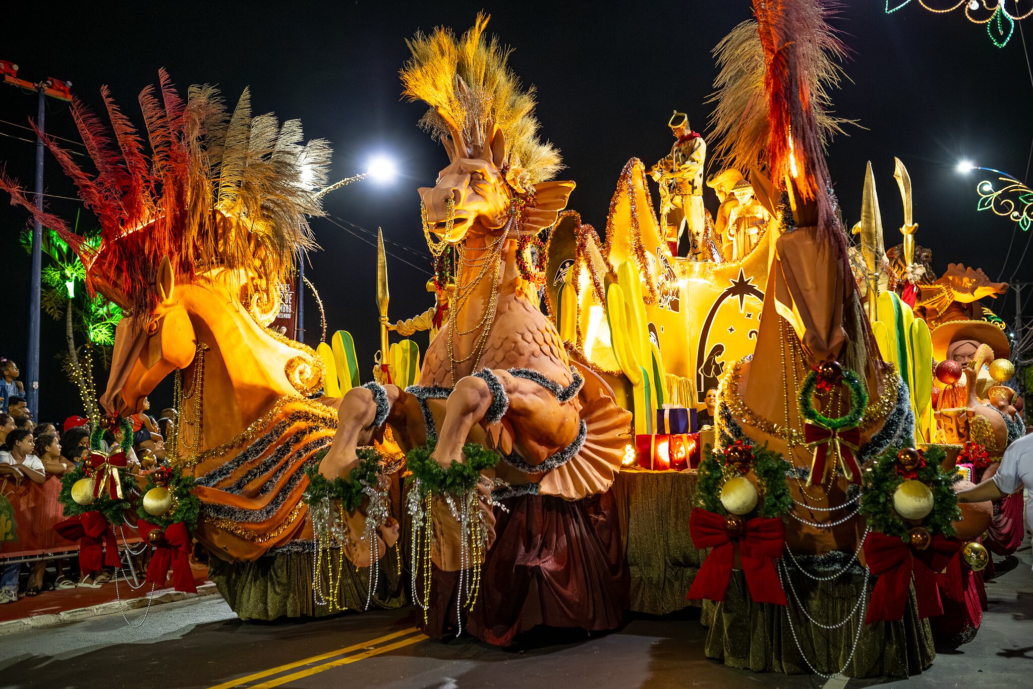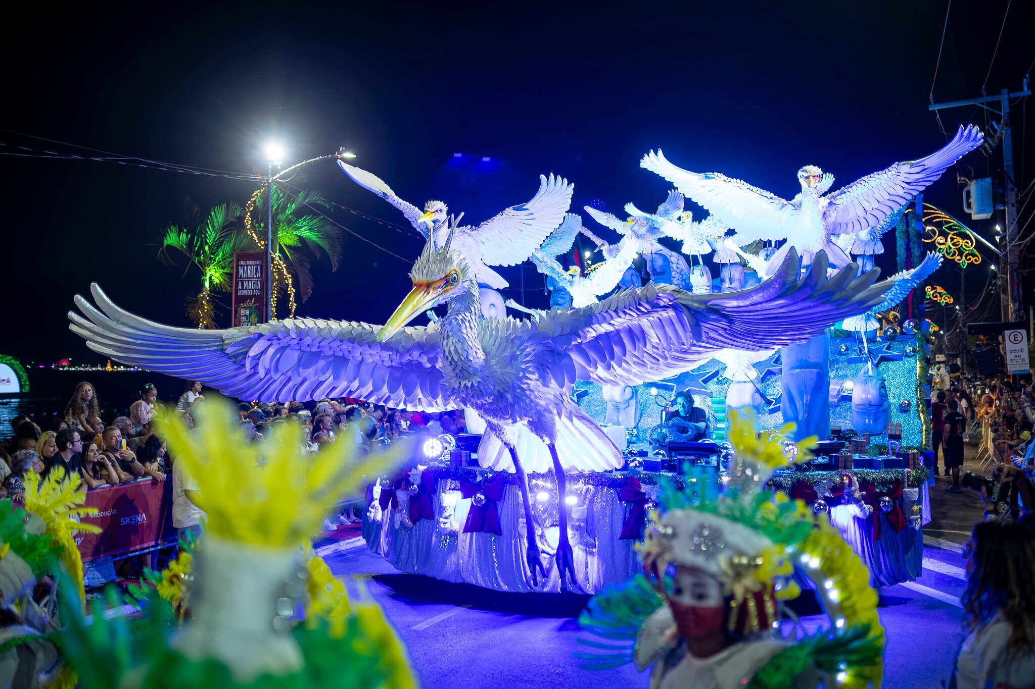 O ponto alto do primeiro dia de atividades do Natal Brasilidades foi a Parada Iluminada, que lotou a orla de Araçatiba para ver o show com seis carros alegóricos e cerca de 600 moradores que compuseram uma apresentação baseada na história do Natal reinterpretada por elementos da cultura brasileira e das tradições maricaenses.