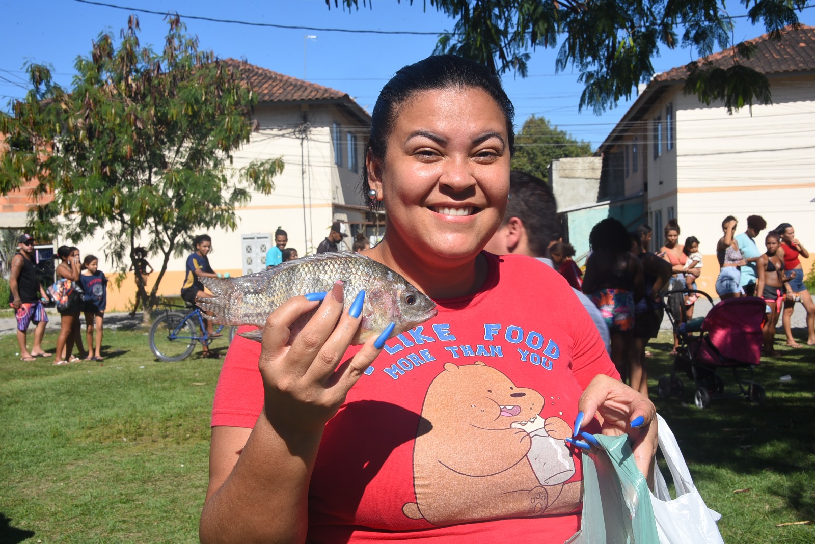 Outro morador do mesmo conjunto, José Carlos Menezes, de 41 anos, motorista de aplicativo, também celebrou a iniciativa. “É um apoio importante. Além do peixe, as verduras estão fresquinhas. Isso faz diferença na alimentação da nossa família”, disse o motorista acompanhado dos filhos.