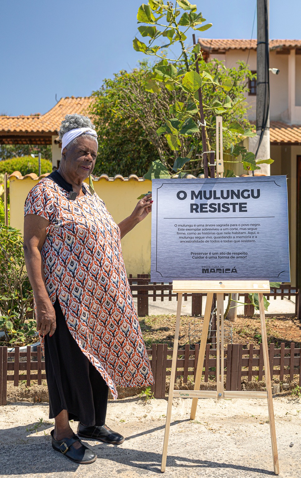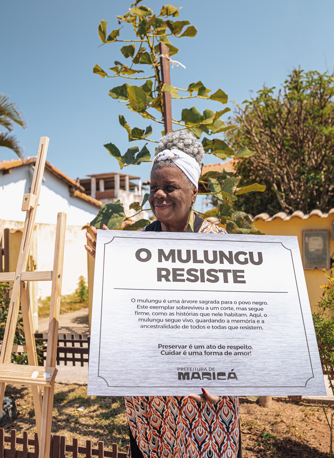A Prefeitura de Maricá prestou, na manhã desta segunda-feira (15/09), uma homenagem à escritora Conceição Evaristo, em frente à casa onde ela reside, no bairro Divinéia. O ato simbólico celebrou a resistência e a ancestralidade representadas pelo Pé de Mulungu, árvore cortada em março deste ano e que, desde então, renasce a partir de uma muda que brotou no mesmo local.